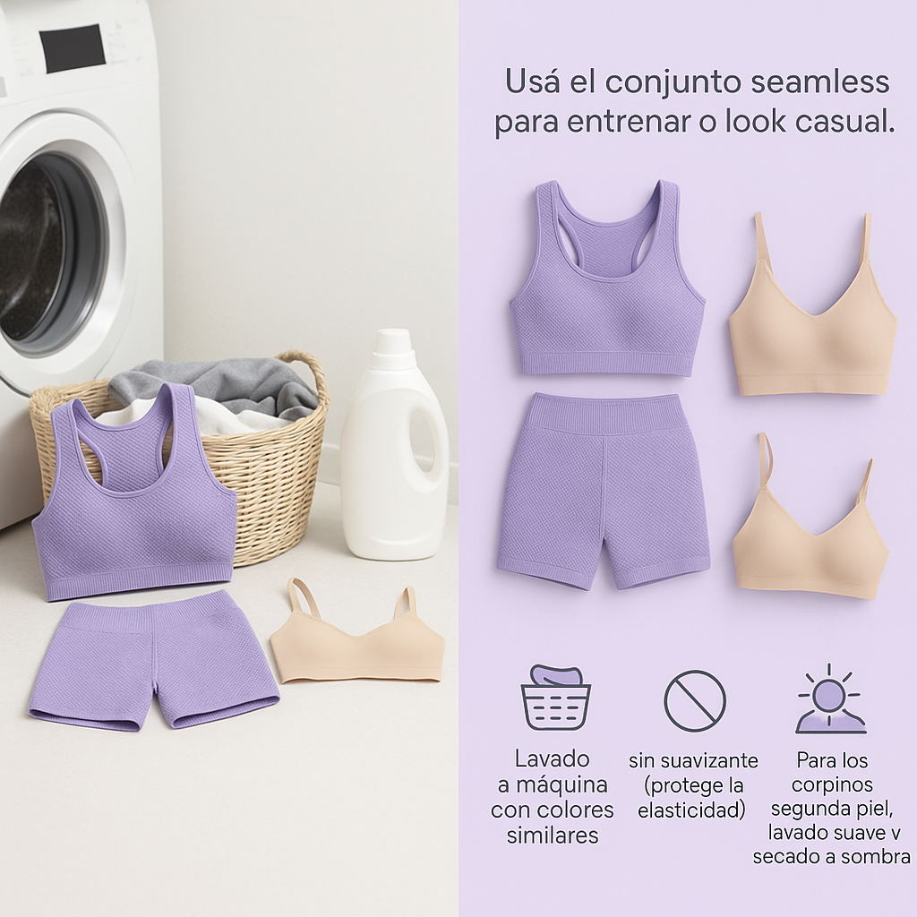 Usá el conjunto seamless para entrenar o look casual. Lavado a máquina con colores similares; sin suavizante (protege la elasticidad). Para los corpiños segunda piel, lavado suave y secado a la sombra.