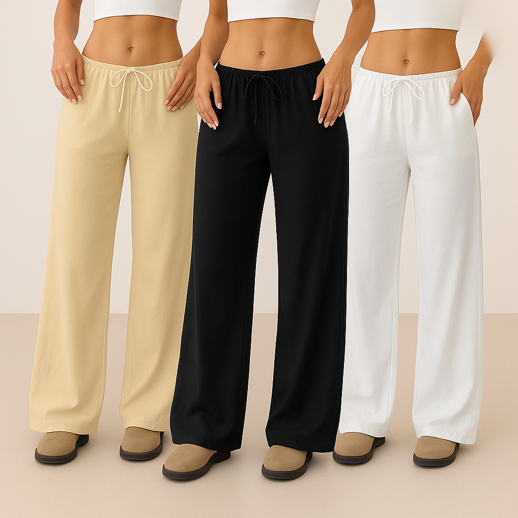 El palazzo usa un lino liviano de caída fluida que no se arruga fácilmente, ideal para el día a día. Los bodys se confeccionan con paneles elásticos de alta resistencia que moldean abdomen, cadera y busto sin restringir tus movimientos.